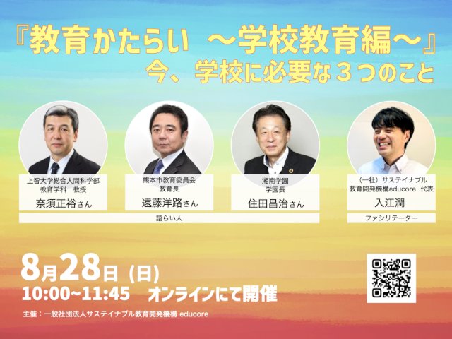 ※「教育かたらい~社会編~」は、9月23日(祝)10:00~11:45を予定しています。次回は、永田佳之さん(聖心女子大学教授)や中原健聡さん(Teach For Japan代表理事)ほかを語らい人としてお迎えし語らいます。お楽しみに♪