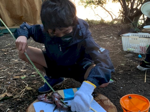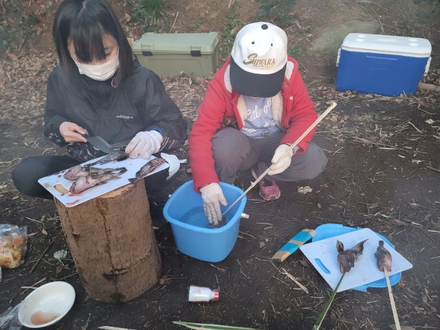 釣れた魚は、削って作った竹串に刺して「焼き魚」